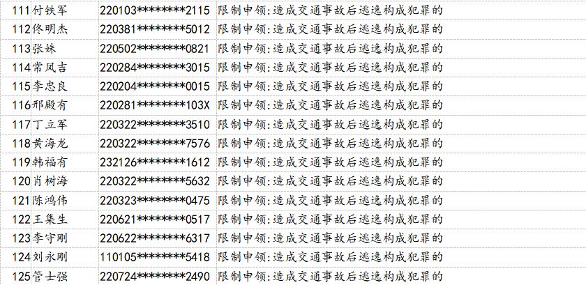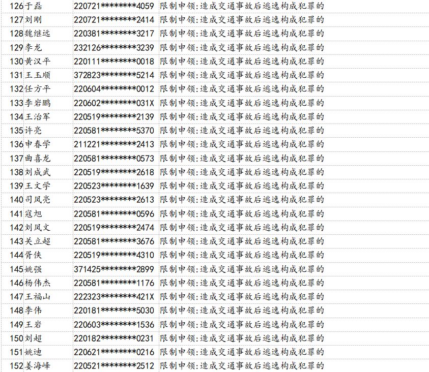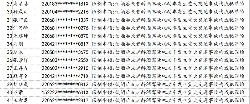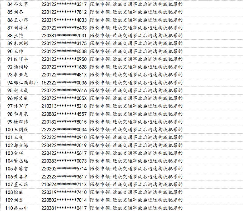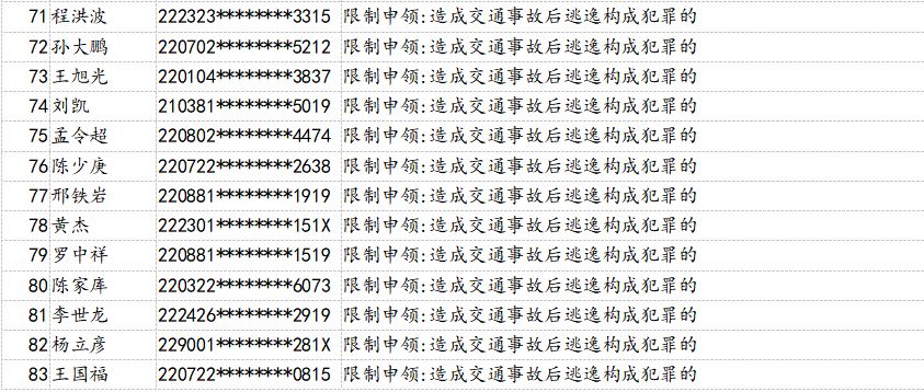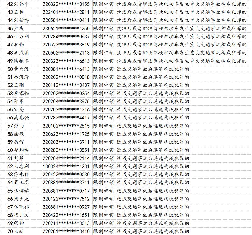 為了持續(xù)提升全民交通安全意識、文明意識、法治意識,有效預防和減少道路交通事故,吉林省公安廳交警總隊積極組織全省交警部門大力開展“五大曝光”行動,即突出違法車輛曝光,典型事故案例曝光,事故多發(fā)路段曝光,高危風險運輸企業(yè)曝光,終生禁駕人員曝光。日前,吉林省交警總隊梳理曝光了158名因醉駕或造成*亡事故承擔同等以上責任、造成交通事故后逃逸構成犯罪、發(fā)生重大事故構成犯罪等被終生禁止考取駕照的人員。