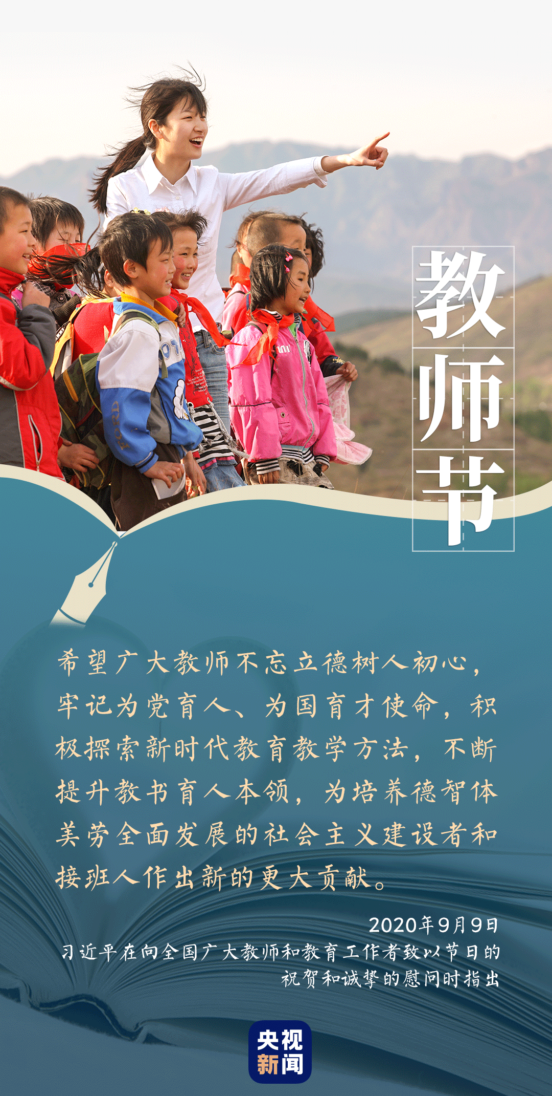 2015年9月9日,習(xí)近平給“國(guó)培計(jì)劃(2014)”北京師范大學(xué)貴州研修班全體參訓(xùn)教師回信,指出“ 發(fā)展教育事業(yè),廣大教師責(zé)任重大、使命光榮”。